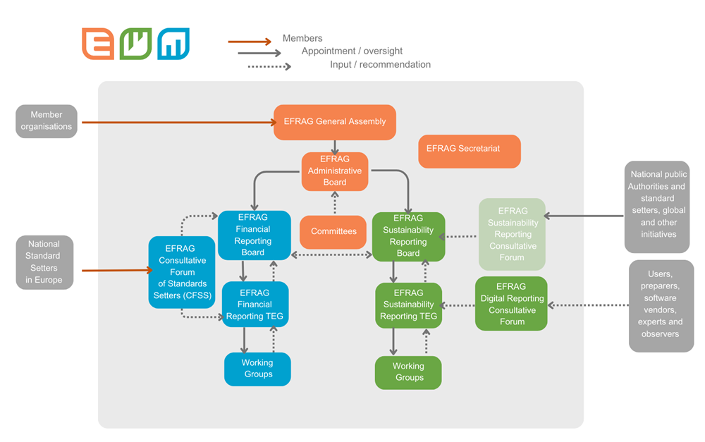 EFRAG has a tiered governance structure, where EFRAG Reporting Boards and EFRAG Reporting Technical Working Groups focus on technical activities. These groups are governed and overseen by EFRAG Administrative Board who in turn is accountable to EFRAG General Assembly.